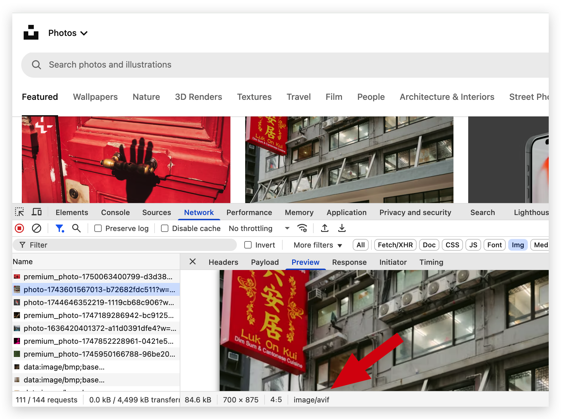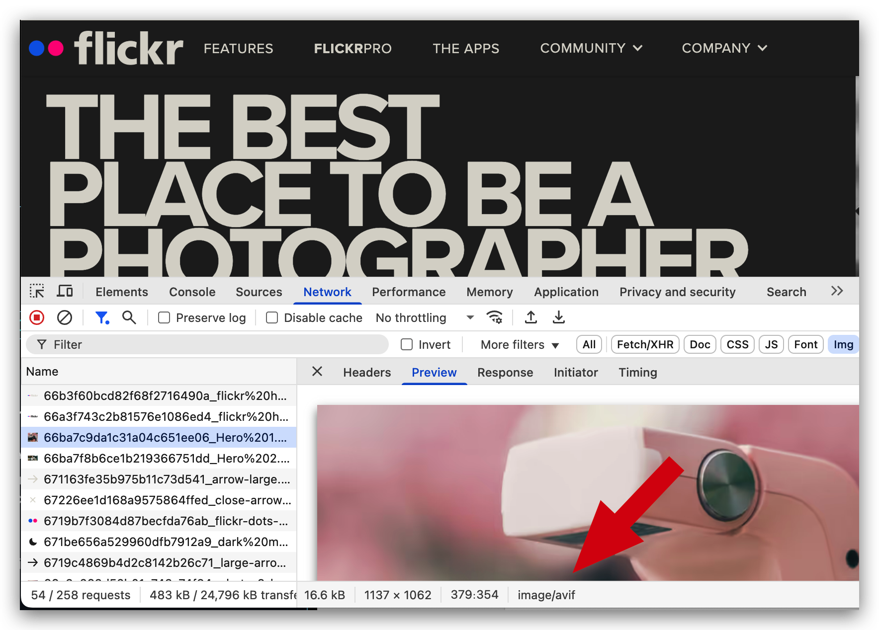 选定了工具,接下来是看什么样的输出格式适合我的站点。其实在做 flic.cc 之前,我的站点就已经运行了一段时间,之前选定的是 WebP。原因很简单,它的压缩比更高,相同文件体积下它比 JPEG 存储了更多图像信息,换句话说,图像质量更好。在推友的提醒下,我还了解到有更体积更小的选择,AVIF 格式。