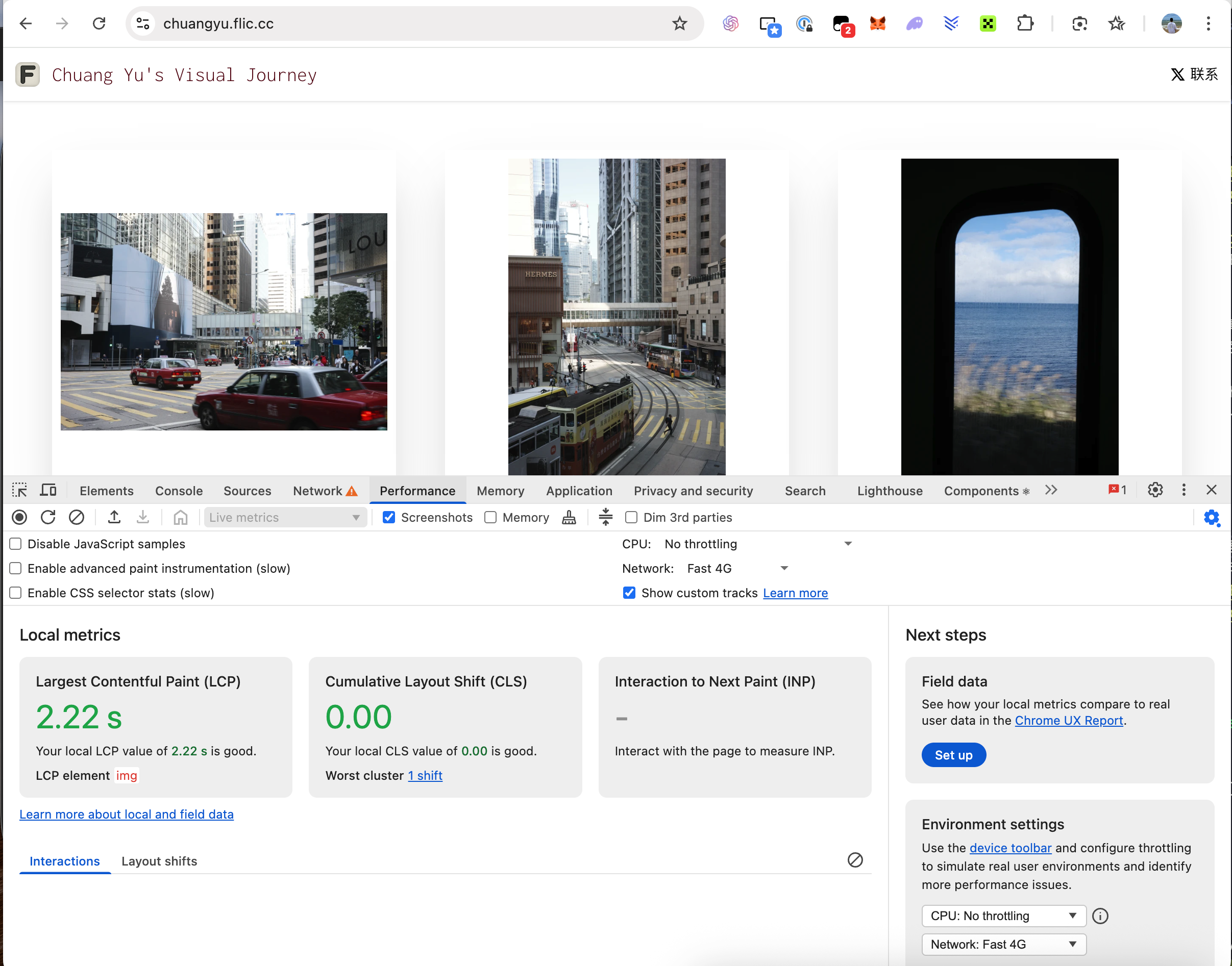 在以上配置下,大多数照片只有不到 80Kb 的大小,chuangyu.flic.cc 站点的 LCP 值为 2.10s(4G 网络下),符合预期。